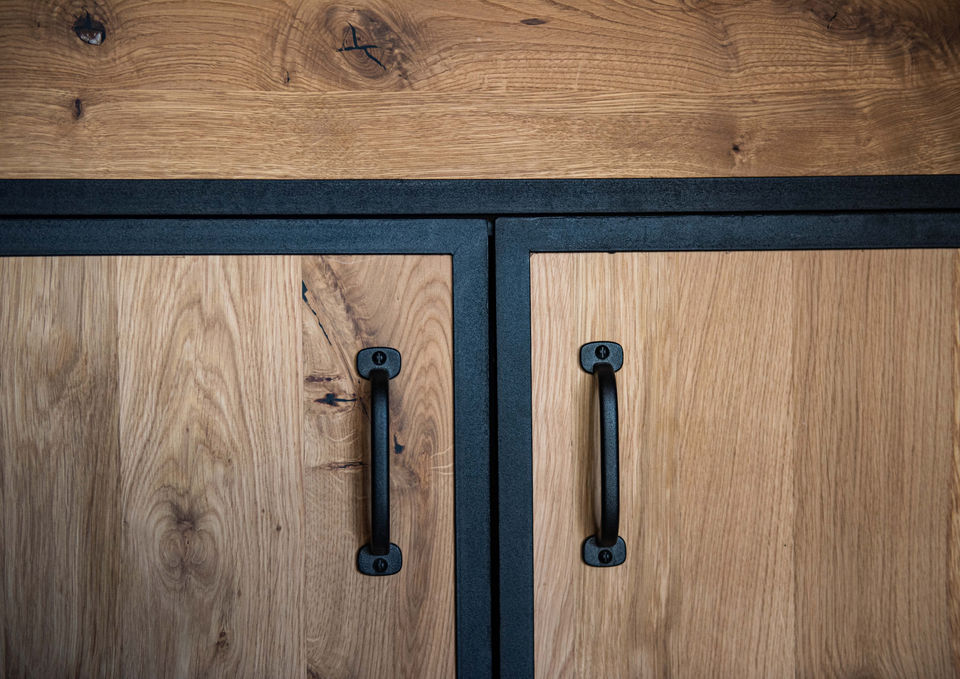 במטבח "פאבלו" תמצאו חזיתות אלון טבעי עם פרזול ברזל שחור, קווים גיאומטריים שמחלקים את החזיתות בקצב נוקשה־אך־אלגנטי, ומשטחי עבודה שתוכננו לשימוש יומיומי, קשוח ונוח.